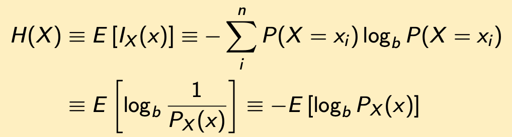 H(X) = E[I(X)] = 1/2 * log(1/(1/2)) + 1/2 * log(1/(1/2)) = log 2 = 1