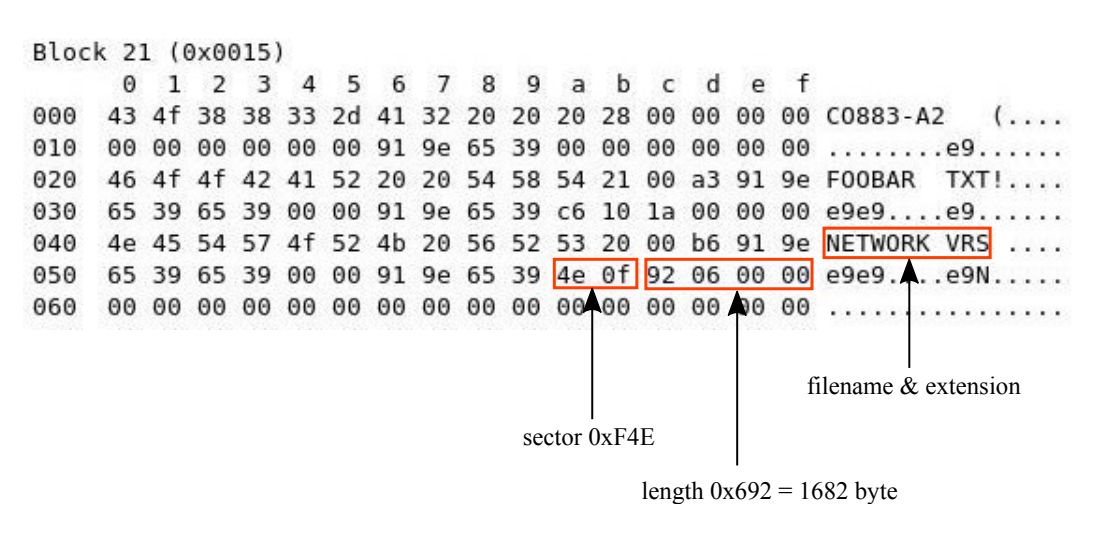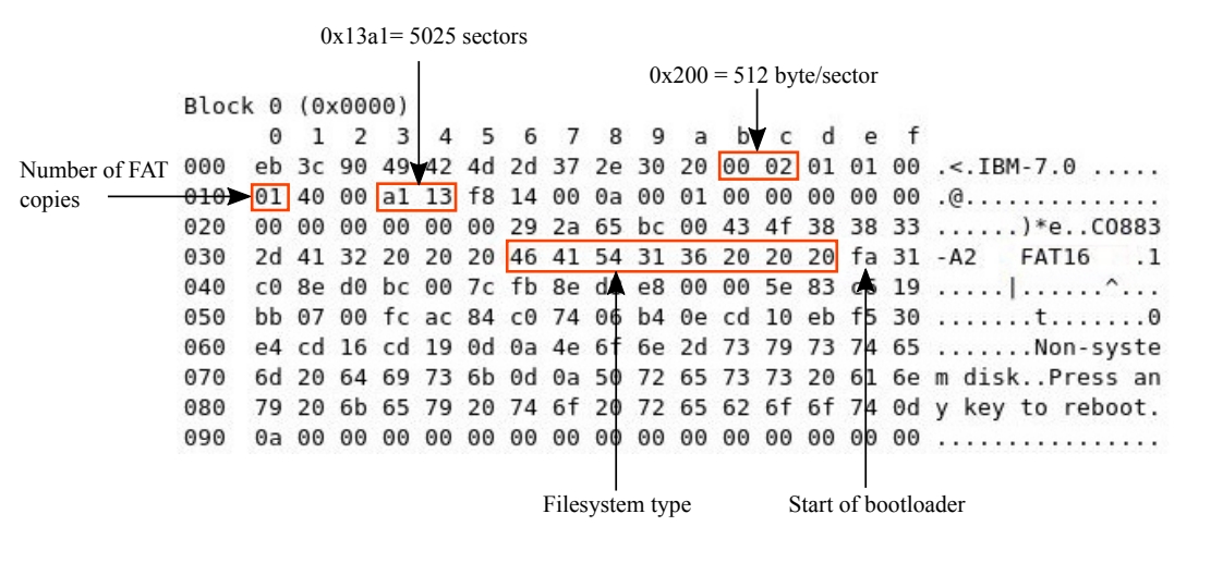 这个图是其中boot sector的16进制实例。这里面红色的圈圈住的信息,所对应的位置都可以查表得到。