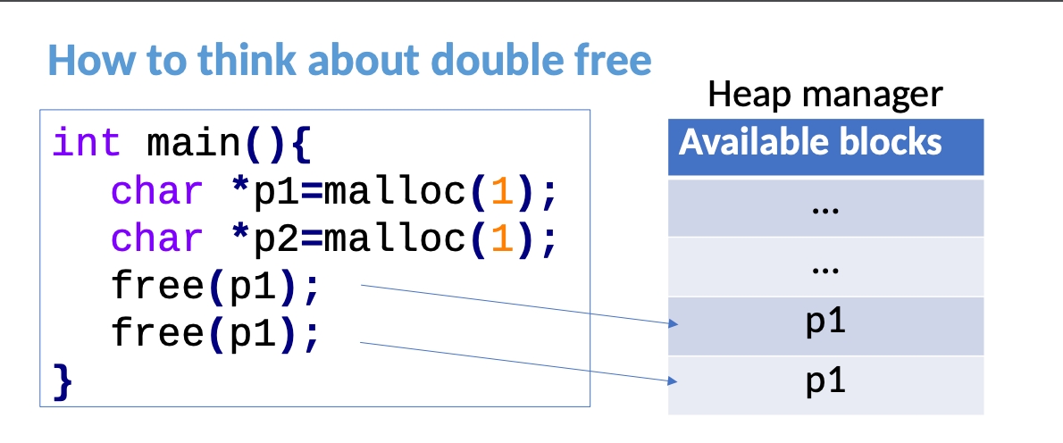 不要对一个地址双重释放两次,不然会崩溃。因为在可用blocks中,会出现两个p1。